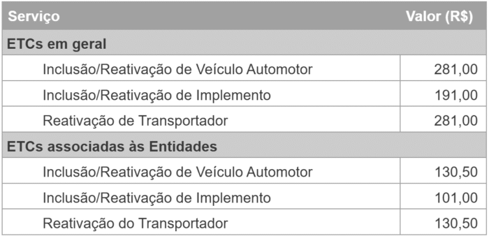 Conforme definido pela Confederação Nacional do Transporte (CNT) e estabelecido pelas Federações representantes da categoria das Empresas de Transporte de Cargas (ETC), a tabela de valores de serviços do RNTRC entrará em vigor na próxima quarta-feira (01/10).